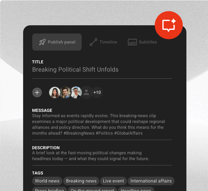 Leverage AI and automation to identify, tag, and clip key moments instantly. Then add dynamic overlays, graphics and branded elements to maximize your brand’s impact.