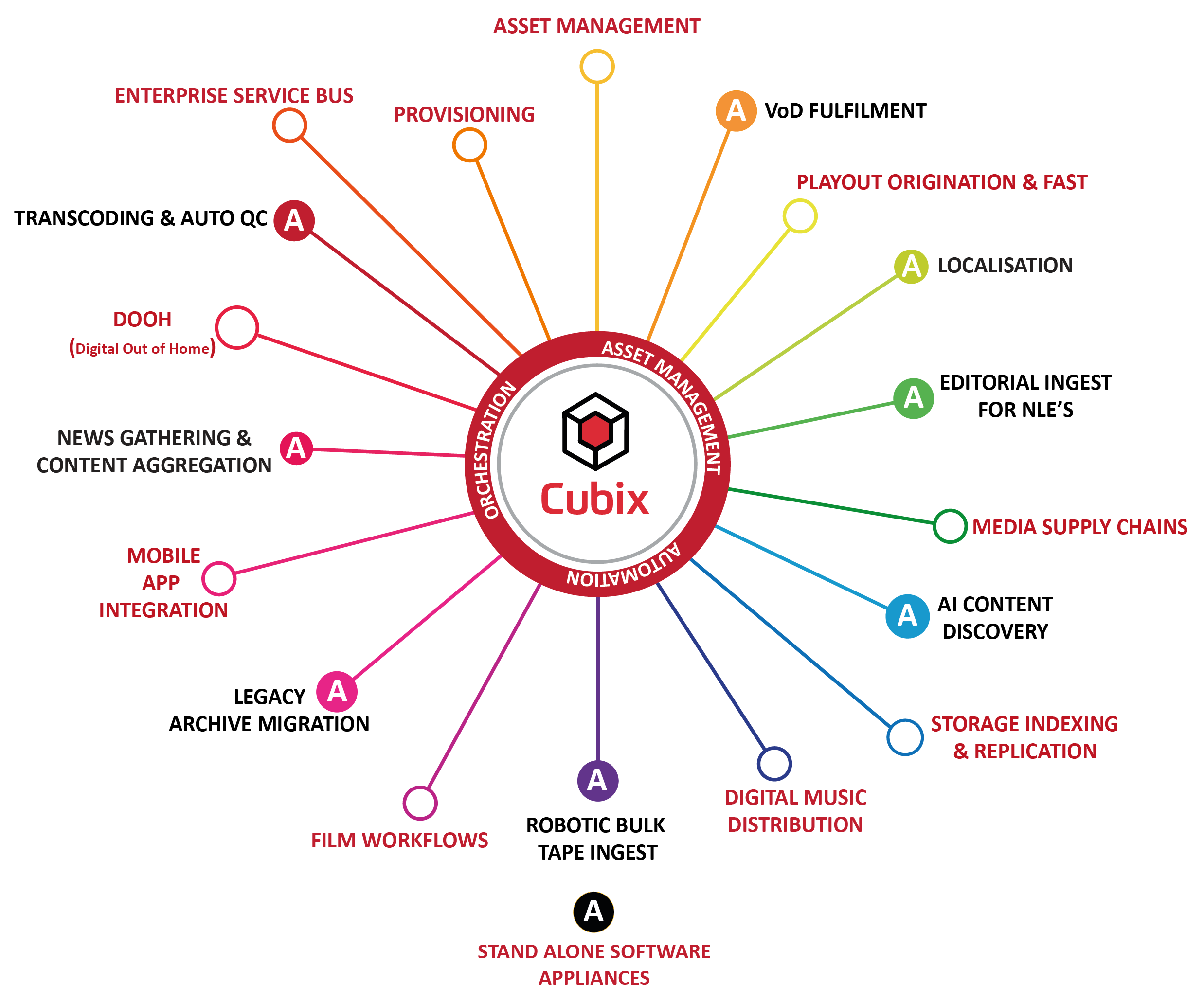 Taking advantage of Ortana’s 80+ API integrations, Cubix Connect was designed from the onset to be deployable as a global enterprise service bus for connecting a broad range of technologies. Connect’s tightly integrated micro-connections provide the technology glue to orchestrate and automate data flow between devices and software services. Connect can also dynamically provision services on demand, based on configurable rules, triggers and SLAs