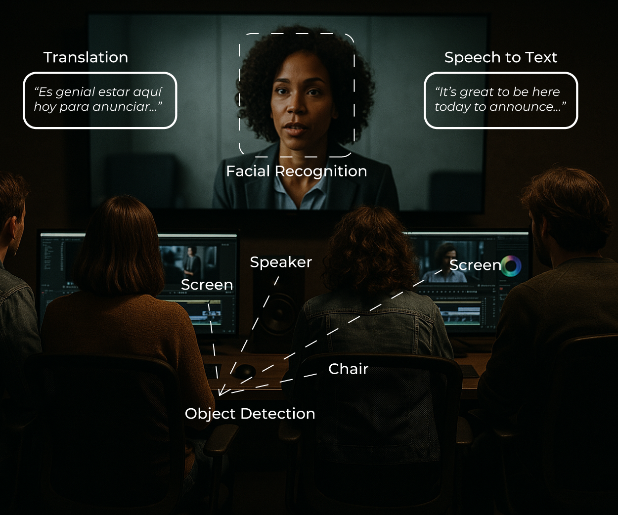 Providing the ability to securely orchestrate AI/ML cloud based services for ASR, Object Detection, Image Detection, Translation (and associated, Language Detection). The metadata from these services is stored against the asset or pushed via API into a target MAM.