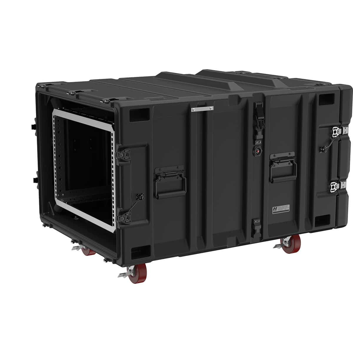 The Classic-V 7U rack mount case has moulded in edge casters. These make the cases very transportable. Coupling catches allow the case to be easily and securely stacked. The patented metal insert has catch and hinge attachment points to distribute the load to the case walls. The recessed hardware means it is protected upon impact.